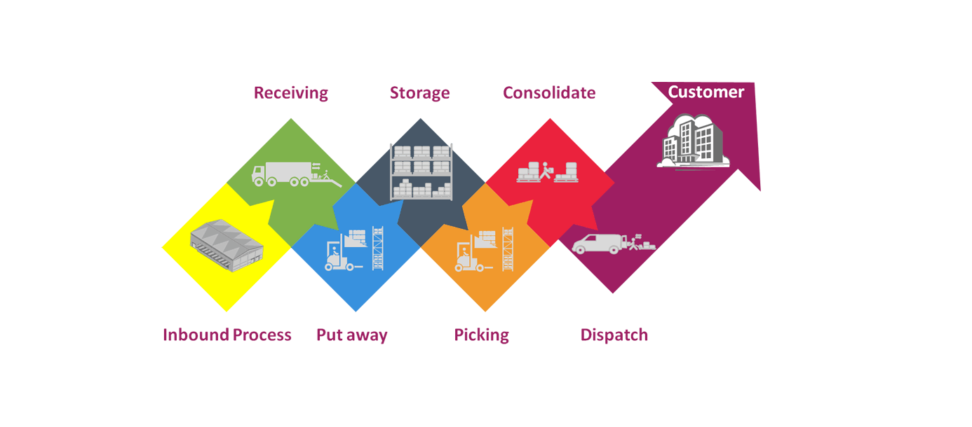 Standard warehousing process flow diagram and standard workflow diagram used for process identification for further evaluating effectiveness and profitability of overall business process.